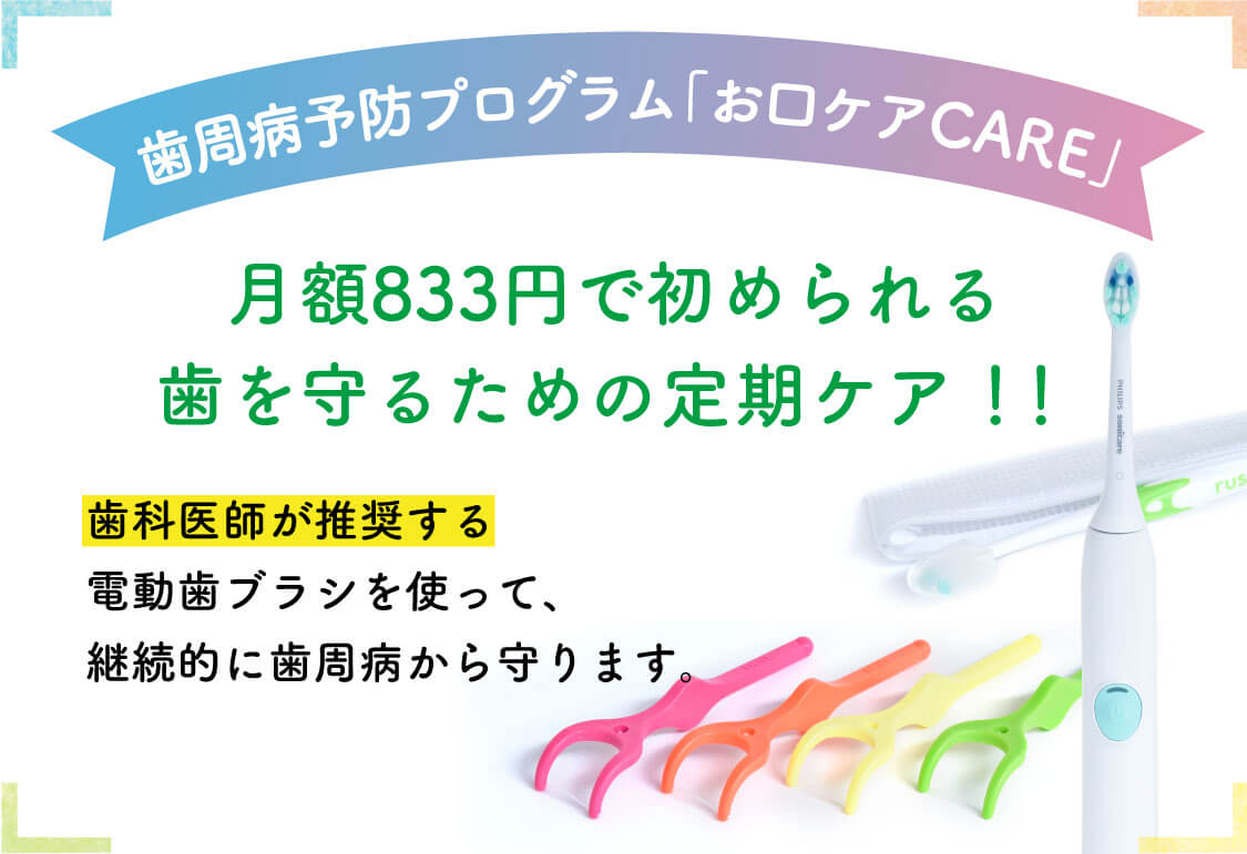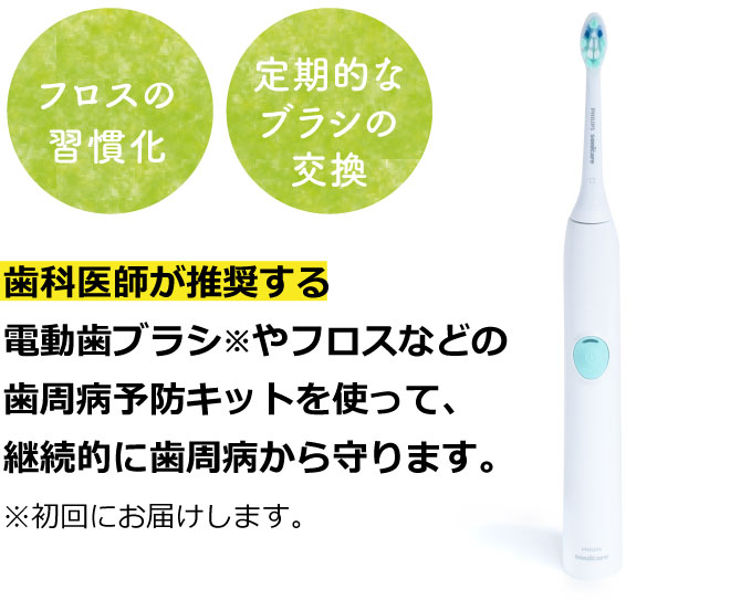 お口ケアCAREは、歯科医師が推奨する電動歯ブラシやフロスなどの歯周病予防キットを使って、歯周病から守ります。